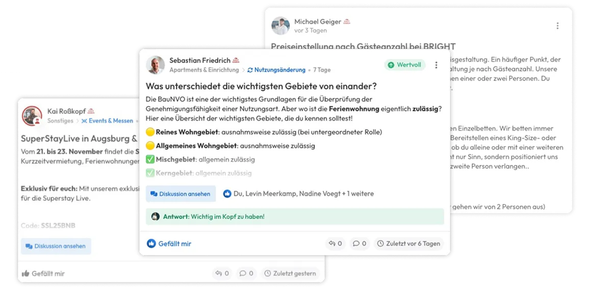 Von konkreten Diskussionen über Buchungsstrategien oder Co-Hosting-Modelle bis hin zu strategischem Austausch über Prozesse, Wachstum und Mindset: Hier triffst du auf Gastgeber, die alle dasselbe Ziel haben: